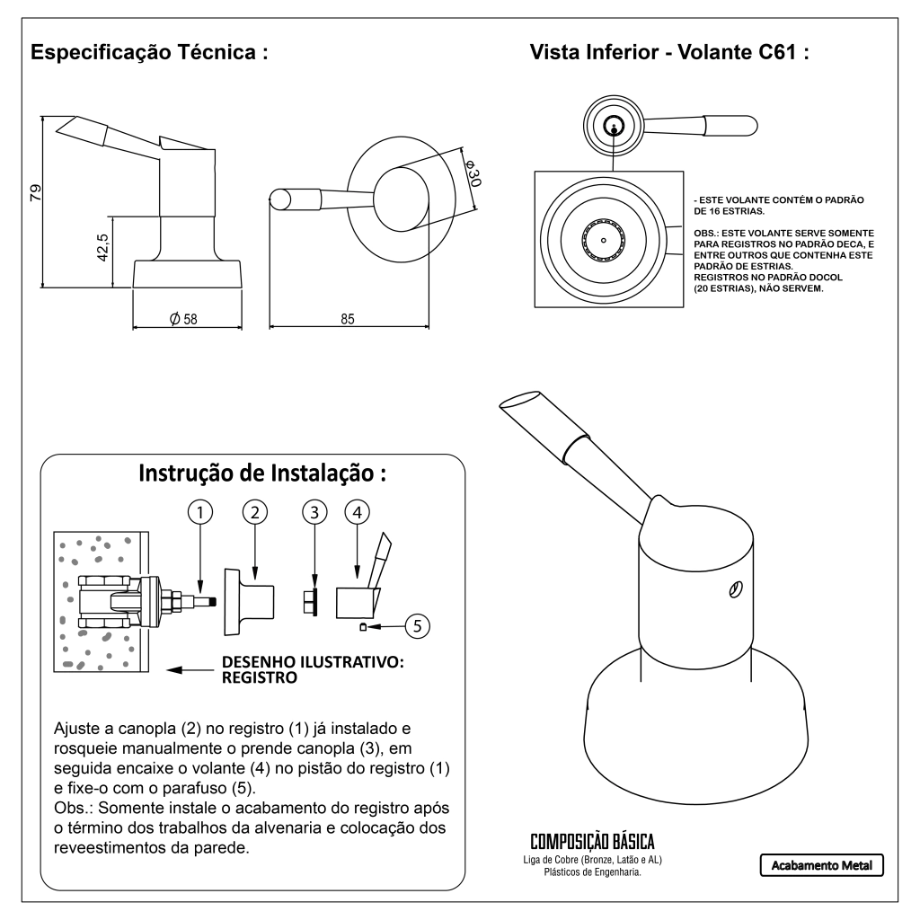 Este acabamento para registro de pressão e gaveta é compatível com os tamanhos de ½”, ¾” e 1” polegada, estria Deca.