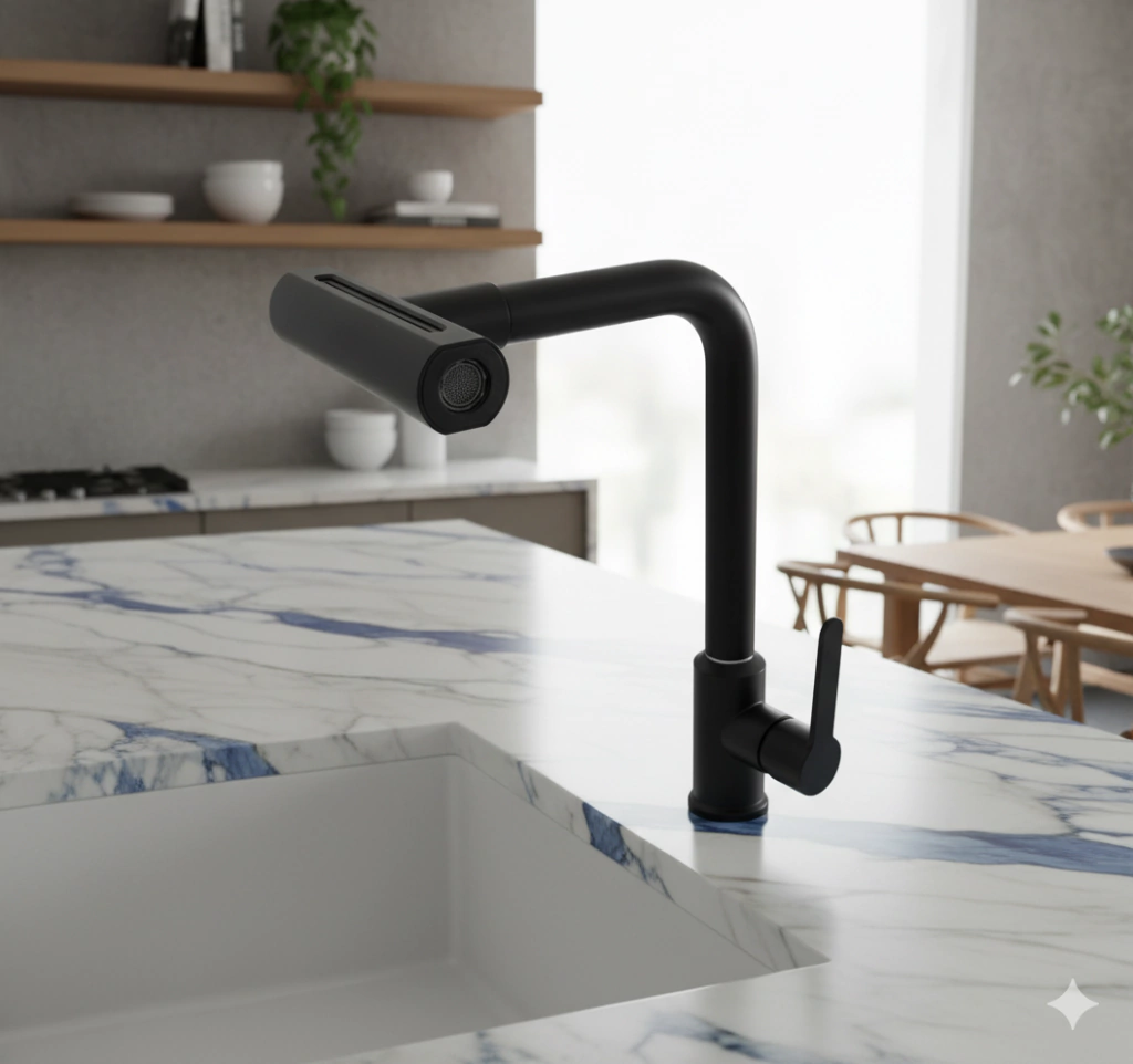 Torneira Gourmet de Cozinha Preto Fosco 4 Jatos | Bica Móvel | Design Premium Transforme sua cozinha com uma torneira moderna, sofisticada e muito mais eficiente! Este modelo gourmet cromado possui um grande diferencial: 4 jatos de água, oferecendo mais potência, versatilidade e controle para facilitar o dia a dia. A troca de jato proporciona desde um fluxo suave para tarefas delicadas até um jato mais concentrado e forte para remoção de sujeira pesada, tudo isso com um acabamento cromado premium que garante brilho intenso e alta resistência ao tempo. Diferenciais que vendem MUITO: * 4 jatos de água mais força, limpeza eficiente e versatilidade * Bica móvel (giratória) alcança toda a área da pia * Acabamento cromado premium brilho intenso e alta durabilidade * Modelo gourmet moderno design sofisticado para cozinhas planejadas * Acionamento lateral suave conforto no uso diário * Instalação em mesa/bancada Por que o recurso de 4 jatos é tão procurado? * Economia de água com fluxo mais direcionado * Remoção mais fácil de gordura e sujeira difícil * Mais rapidez no preparo e na limpeza * Torneira se adapta a qualquer necessidade da cozinha * Aumenta a percepção de produto premium (melhor conversão!) Especificações Técnicas: * Tipo: Torneira de Cozinha Gourmet * Acabamento: Cromado * Funções: 4 jatos de água * Estilo: Moderno / Premium * Bica: Alta, móvel, giratória * Instalação: Mesa / Bancada * Material: Liga metálica de alta qualidade * Uso: Cozinha / Área Gourmet / Lavanderia * Acionamento: Lateral Garantia de fábrica: 5 anos