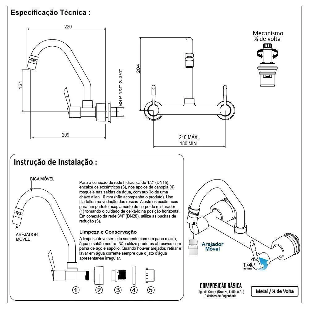 - Mecanismo: cerâmico ¼” de volta