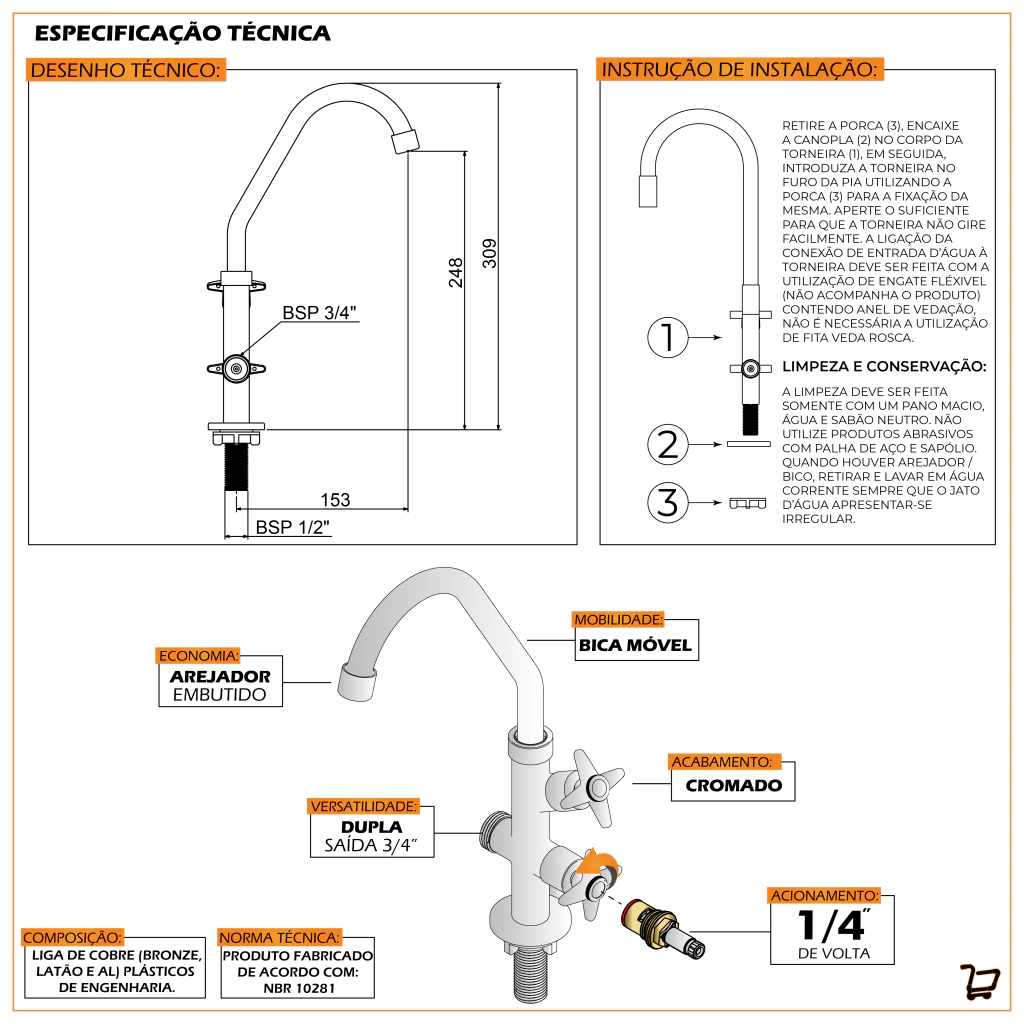 A torneira pia cozinha tanque duas saídas flexível possui arejador moderno que torna a saída de água espumosa e lisa, isso minimiza salpicos e permite uma economia de água de até 30%. O acionamento possui mecanismo cerâmico ¼” de volta que é muito eficaz e de rápido manuseio, que também ajuda a proporcionar grande economia de água.