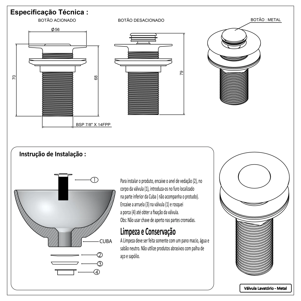 -Diâmetro do encaixe na pia: 5,6 Centímetros (Medida Superior)